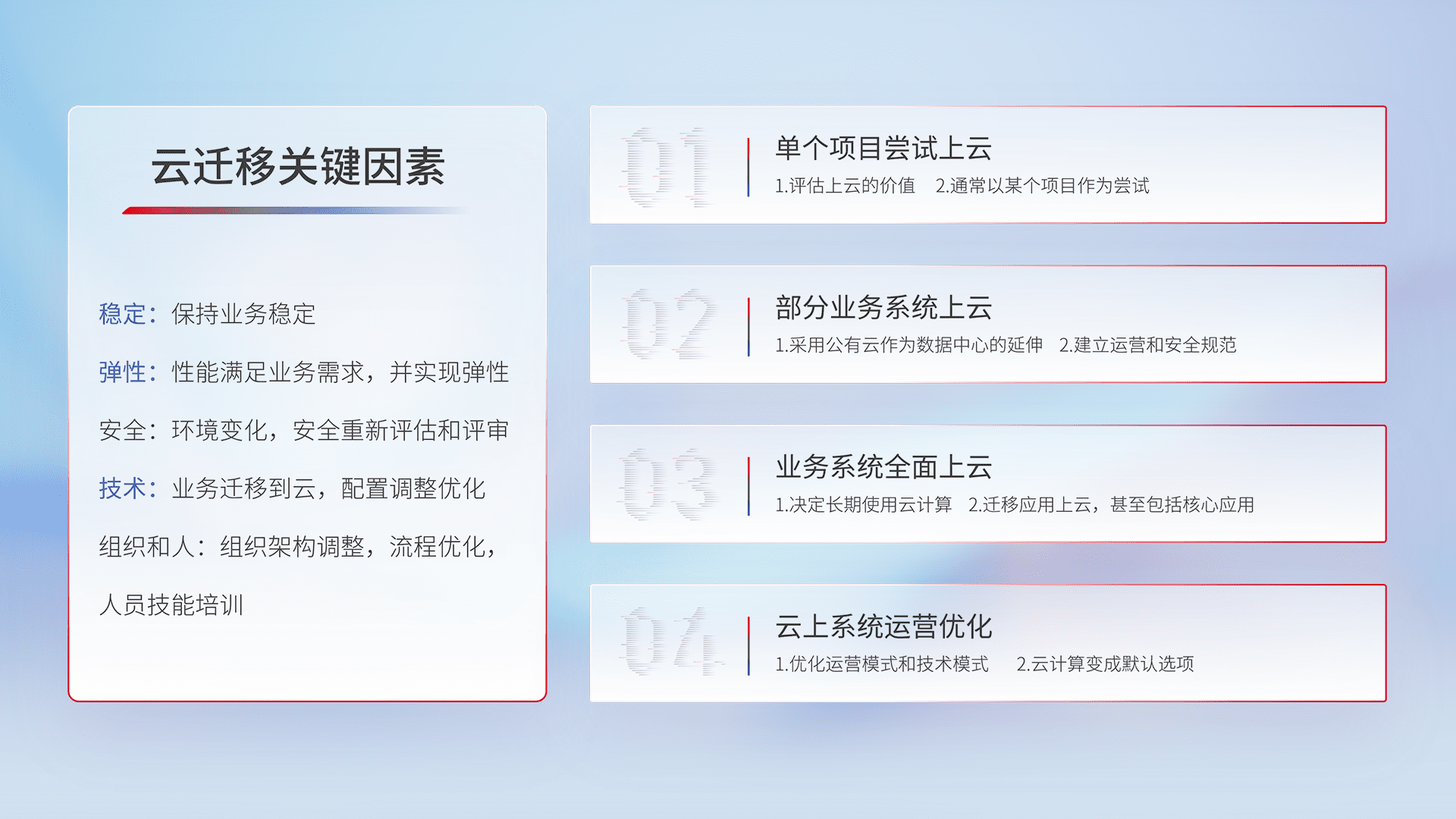 结合实际业务,,,从规划设计、、云平台选型、、、、云原生改造、、、数据迁移、、、集成交付,,,,迁移全过程为客户识别最佳上云路径,,,,做好风险识别管理,,,设计网络架构、、、、身份权限、、、、安全审计合规、、、操作审计、、日志审计、、监控告警策略、、、多站点容灾设计等,,对云上基础设施进行整体规划,,,,提升IT治理水平,,以满足弹性、、高可用、、、、高性能的需求。。。