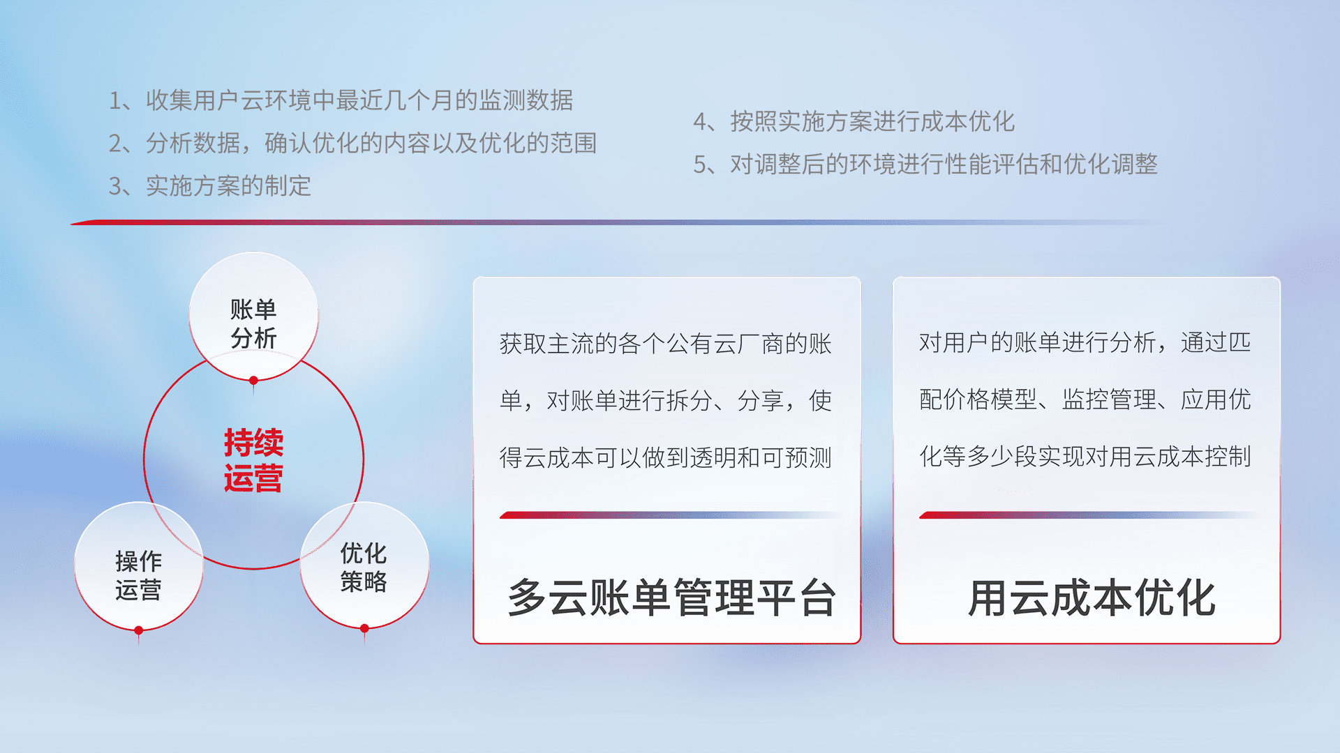 通过多云纳管,,,,以统一的资源数据模型把客户的云资源进行抽象和封装,,,,进而实现对多云资源的统一操作,,保障云资源管理的可靠性、、、、稳定性与可用性。。量身定制化运维内容,,,配置、、、开发运维、、补丁管理、、、、备份、、、、监控、、、、认证和访问管理、、审计和日常巡检等,,,,保障在用云过程中的可靠度,,,,稳定度以及高可用率。。。。